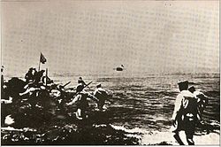 القوات الإيطالية تبدأ بالنزول إلى الشاطئ الليبي في بداية الحملة البرية الرامية إلى احتلال ليبيا.