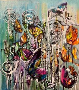 بخطوط من اللون الأبيض دائرية الشكل حُددت بعض الأماكن في اللوحة ، هل هي حركة الفراشات او حين ” غفلت الألوان ” أرادت الرسامة أن تعيدها ألى حيث كانت ؟
