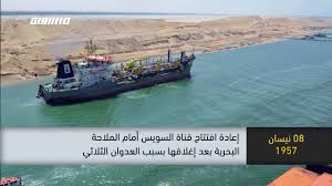 إعادة افتتاح قناة السويس أمام الملاحة البحرية بعد إغلاقها بسبب العدوان الثلاثي.