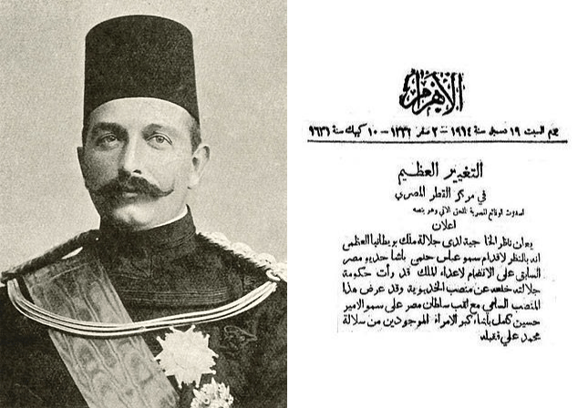 عباس حلمي الثاني يعلن وزير الخارجية لدى جلالة ملك بريطانيا العظمى أنه بالنظر لإقدام سمو عباس حلمي باشا خديوي مصر السابق على الانضمام لأعداء جلالة الملك رأت حكومة جلالته خلعه من منصب الخديو. عباس حلمي الثاني