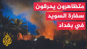 محتجون عراقيون يقتحمون السفارة السويدية في بغداد بعد إحراق القرآن في السويد على يد لاجئٍ عراقي مسيحي.