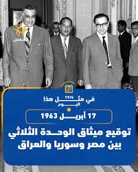 فى 17 من أبريل عام 1963، تم توقيع اتفاقية الوحدة بين مصر وسوريا والعراق، حيث وقعها كل من الرئيس جمال عبد الناصر و أحمد حسن البكر – رئيس الوزراء العراقي – و لؤي الأتاسي القائد العام للجيش السوري ، و تم توقيع الاتفاقية بقصر القبة بالقاهرة . وقد خرجت الجماهير في الدول الثلاث لتعبر عن فرحتها بالاتحاد ، وتعالت الهتافات بحياة الوحدة العربية والحرية والاشتراكية. جاء ذلك الميثاق، بعد وقوع انقلاب عسكرى فى العراق ضد عبد الكريم قاسم، وقيام حركة انقلابية فى سوريا، رفعت شعار الوقوف ضد الانفصال، تنادت القيادتان الجديدتان فى بغداد ودمشق للبحث فى إقامة “وحدة ثلاثية” بين مصر وسوريا والعراق، وأسفرت محادثاتها مع الرئيس الراحل جمال عبد الناصر عن ميثاق 17 أبريل الذى يضع الأساس لإعادة الجمهورية العربية المتحدة، التى تفتت بعد قيام الجيش السورى بانقلاب عسكرى فى سبتمبر 1961، حيث أعلنت سوريا انتهاء الوحدة وأعلنت الجمهورية العربية السورية”.!!!!!!!