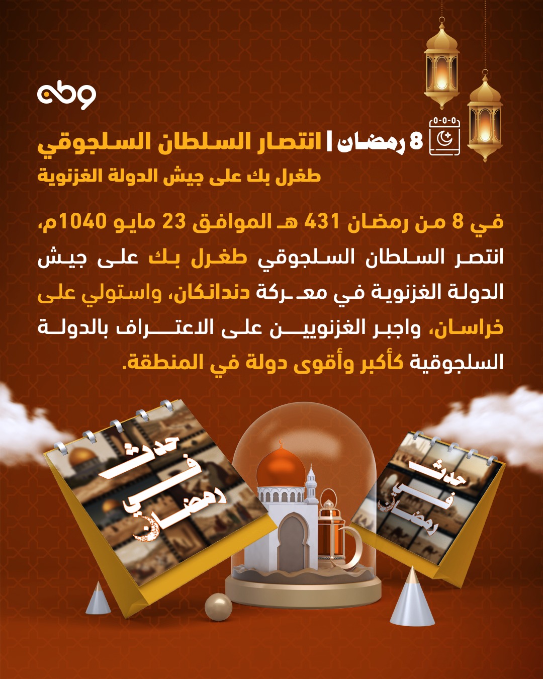 السلطان السلجوقي طغرل بك ينتصر على جيش الدولة الغزنوية في معركة داندقان ويستولي على خراسان ويجبر الغزنويين على الاعتراف بالدولة السلجوقية كأكبر وأقوى دولة في المنطقة.