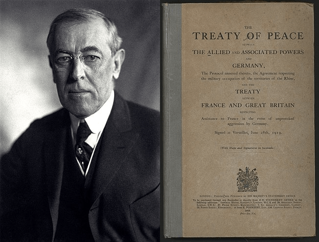 الرئيس الأمريكي وودرو ويلسون يعرض نص معاهدة فرساي التي أنهت الحرب العالمية الأولى.
