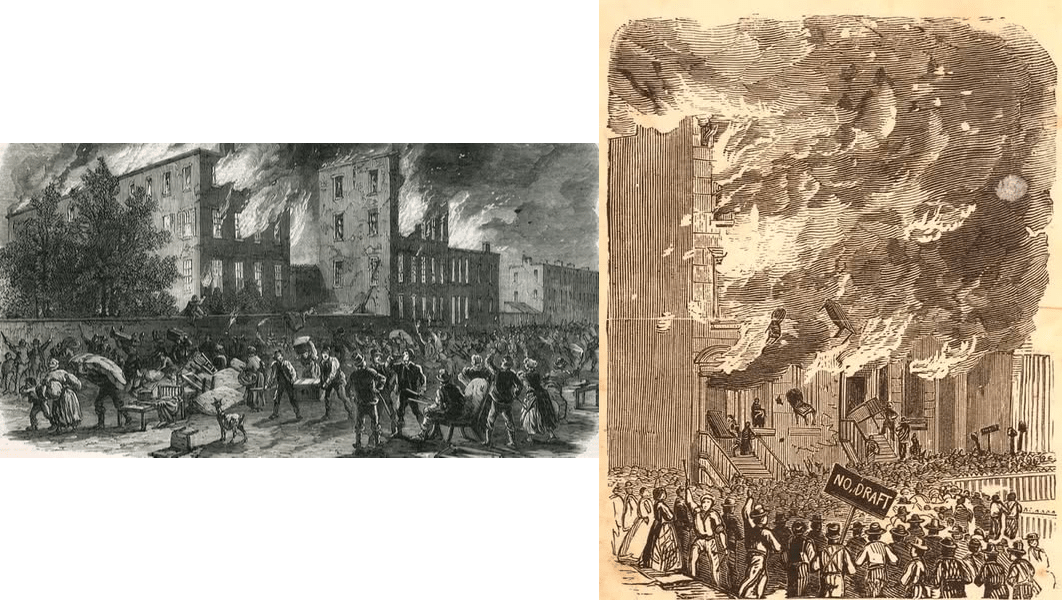 أثار قانون التجنيد الجديد موجة من الغضب والفوضى بعدد من المدن، كديترويت وبوسطن، اندلعت أعنفها بمدينة نيويورك صيف 1863. فيوم 13 تموز/يوليو 1863، هاجم الآلاف من العمال البيض، كان أغلبهم من ذوي الأصول الأيرلندية، البنايات الحكومية والعسكرية وأضرموا النيران بالعديد منها وسط ذهول رجال الأمن الذين عجزوا عن احتواء أعمال الشغب بسبب قلة عددهم.