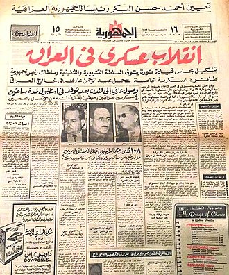 ولقد طرد ونفي عبد الرحمن عارف، رئيس الجمهورية، خلال الانقلاب من قبل حزب البعث، والذي وصل إلى السلطة في عام 1963 حتى حركة 18 تشرين 1963 عندما قام الجيش بلجم مليشيات الحرس القومي واقصاء البكر عن السلطة ليعود مرة أخرى للحكم في عام 1968.!!!!!!!