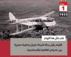 تمر الذكرى الـ92 على القيام بأول رحلة لشركة طيران وطنية مصرية بين مدينتى القاهرة والإسكندرية، وذلك فى اغسطس 1933م، كما كانت من أولى رحلاتها الإسكندرية لمرسى مطروح، وفى أكتوبر من العام نفسه شهدت مصر دخول أول امرأة لعالم الطيران بحصول لطفية النادي، على إجازة طيار خاص.