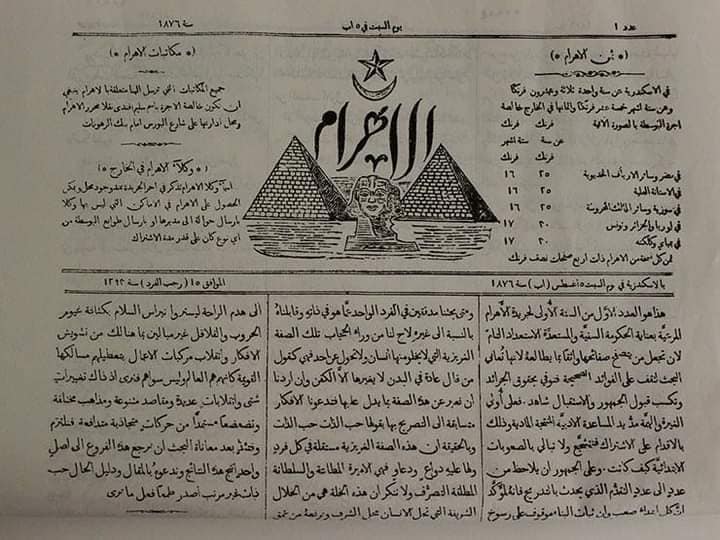 صدر العدد الأول لجريدة الأهرام في يوم السبت 5 أغسطس عام 1876م، الموافق 15 رجب سنة 1293هـ بالإسكندرية، وكانت الجريدة تصدر السبت من كل أسبوع على يد الشقيقين (سليم وبشارة تقلا)، ولها وكلاء في جميع الجهات وعددهم 22 وكيلا في مصر والشام والعراق وتركيا.