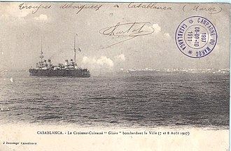 سفينتان حربيتان فرنسيتان تقومان بقصف مدينة الدار البيضاء وذلك بعد قتل أربعة فرنسيين في المدينة.