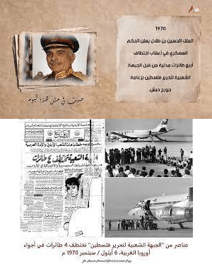 ملك الأردن الحسين بن طلال يعلن الحكم العسكري في أعقاب اختطاف أربع طائرات مدنية من قبل الجبهة الشعبية لتحرير فلسطين بزعامة جورج حبش.