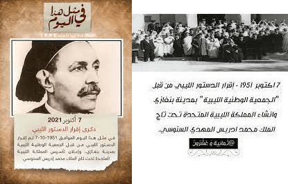 إقرار الدستور الليبي من قبل الجمعية الوطنية الليبية بمدينة بنغازي، وإعلان تأسيس المملكة الليبية المتحدة تحت تاج الملك محمد إدريس السنوسي.