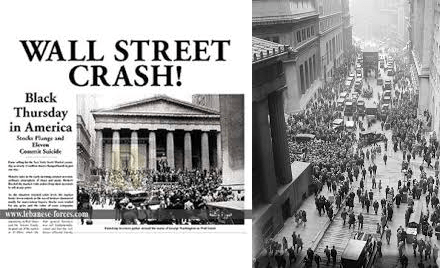 انهيار مؤشر وول ستريت، واعتبر ذلك كأول خطوة للأزمة الاقتصادية العالمية في ثلاثينات القرن العشرين.