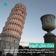 فى مثل هذا اليوم 15 ديسمبر من عام 2001، تمت إعادة افتتاح برج بيزا المائل بعد 11 سنة من الإغلاق والصيانة بتكلفة بلغت 27 مليون دولار أمريكى من دون إيقاف ميلان البرج، وخلال التقرير التالى نستعرض أبرز المعلومات عن البرج.