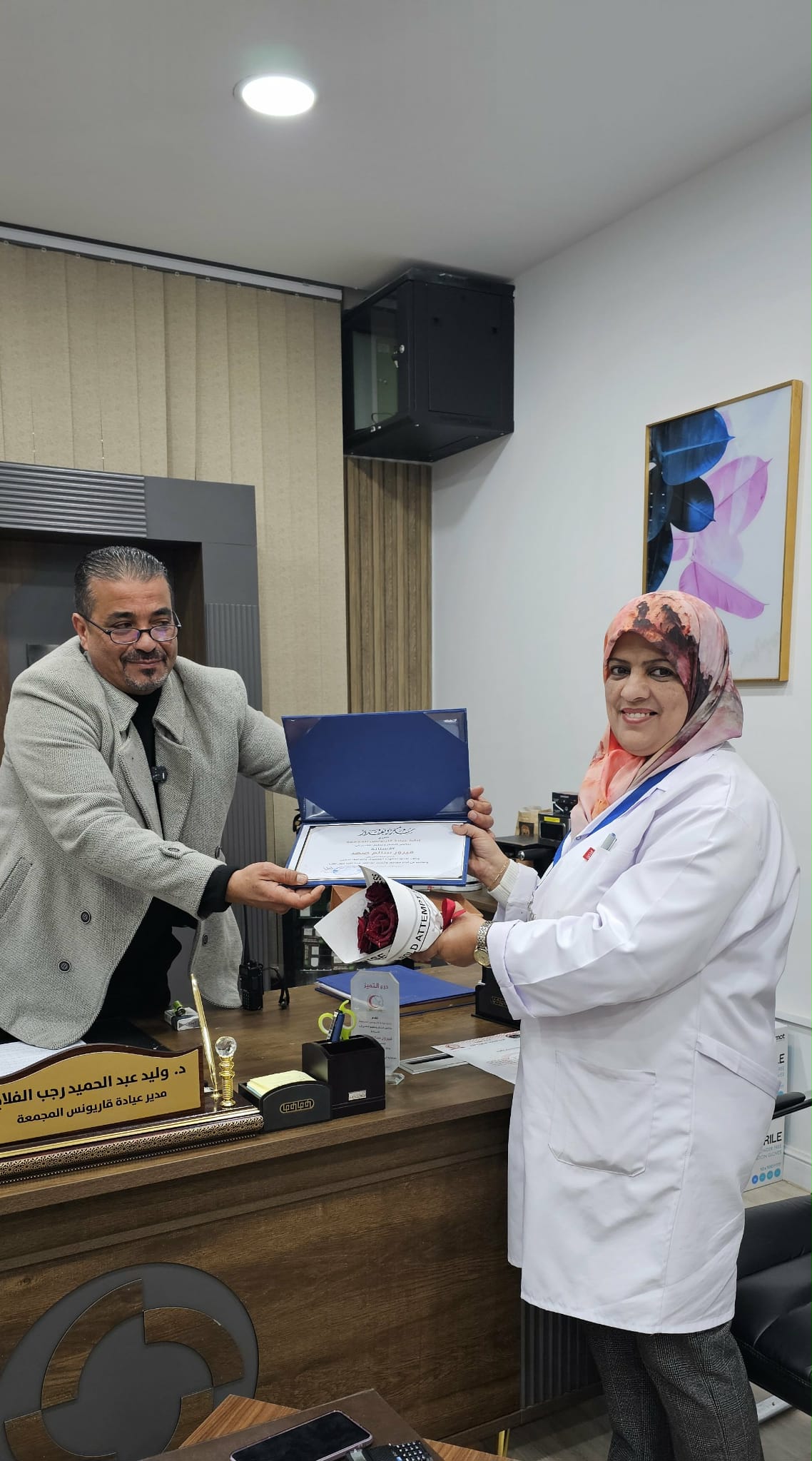 أ. فيروز الصهد رئيس هيئة التمريض بالعيادة تقديرا لجهودها وإسهاماتها الوظيفية وعرفانآ بماقدمته من عطاء له الاثر الكبير في تطور وسير العمل بالعيادة.كما تم أيضا تكريم السيد /حسن برق