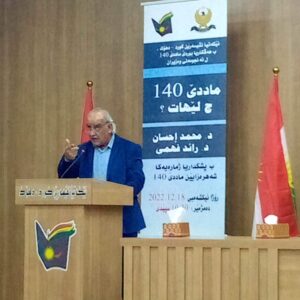 في إطار فعليات ونشاطات اتحاد أدباء الكرد في دهوك وبالتنسيق مع بورد المادة ١٤٠ في مجلس وزراء إقليم كردستان في العاشرة والنصف صباحا من يوم 18 / 12 / 2022 م شارك د. محمد إحسان و د. رائد فهمی فی ملتقی المادە ١٤٠ إلی أین ؟ أدارە حسن سلێڤانی وبحضور السيد محافظ دهوك والبرلمانيين في كردستان وبغداد، والنخبة الثقافية والقانونية المهتمة بالأمر .