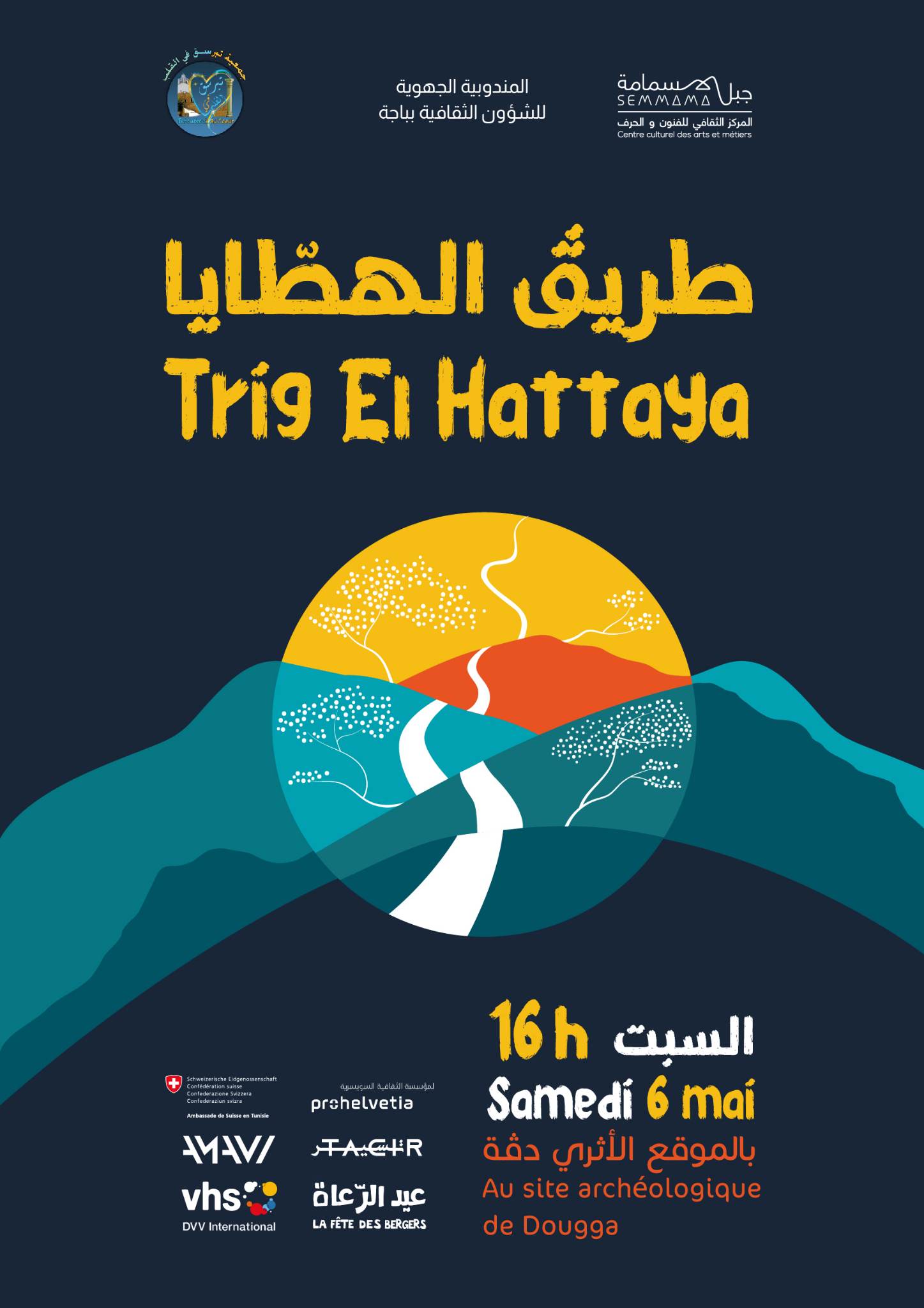 - طريڨ الهطايا ينظمه المركز الثقافي الجبلي سمامة بالتعاون مع جمعية Amavi ومشروع TACIR وبرعاية من وكالة التعاون السويسرياحتفالية دڨة هذا المساء ستكون على شاكلة تنشيط للمعلم العظيم باللوحات الكوريغرافية والصولوات الموسيقية وعرض “مراشين” للمخرج السويسري يوري كاينارو ورعاة سمامة وهو عمل فرجوي طريف يحتفي بحبال الحلفاء وبجبال الغناء.