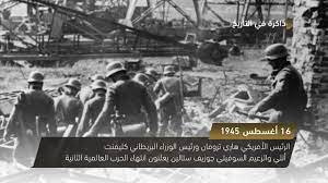 . الرئيس الأمريكي هاري ترومان ورئيس الوزراء البريطاني كليمنت أتلي والزعيم السوفيتي جوزيف ستالين يعلنون انتهاء الحرب العالمية الثانية، والتي كانت قد بدأت في الأول من سبتمبر من عام 1939 في أوروبا وانتهت في الثاني من سبتمبر عام 1945، وشارك فيها بصورة مباشرة أكثر من 100 مليون شخص من أكثر من 30 بلدًا، أدت الحرب إلى وقوع ما بين 50 و85 مليون قتيل حسب التقديرات؛ لذلك تعد الحرب العالمية الثانية أكثر الحروب دموية في تاريخ البشرية.!!